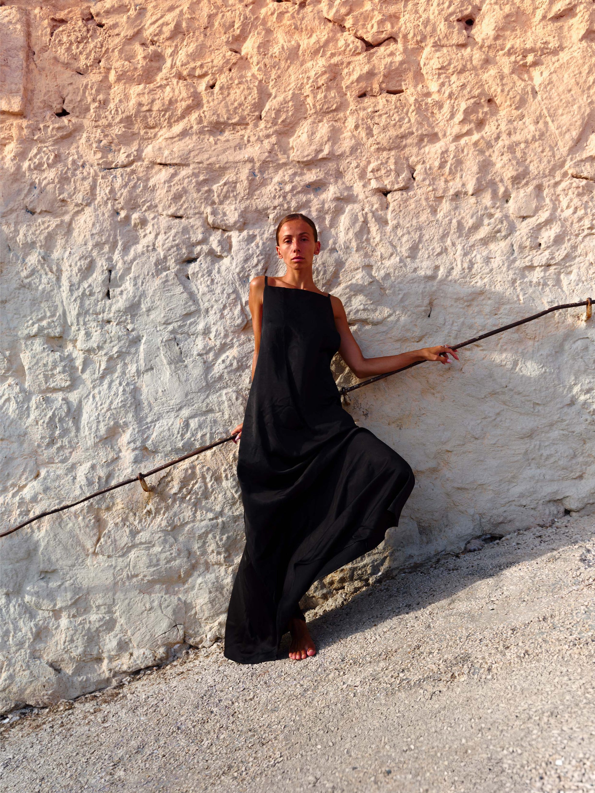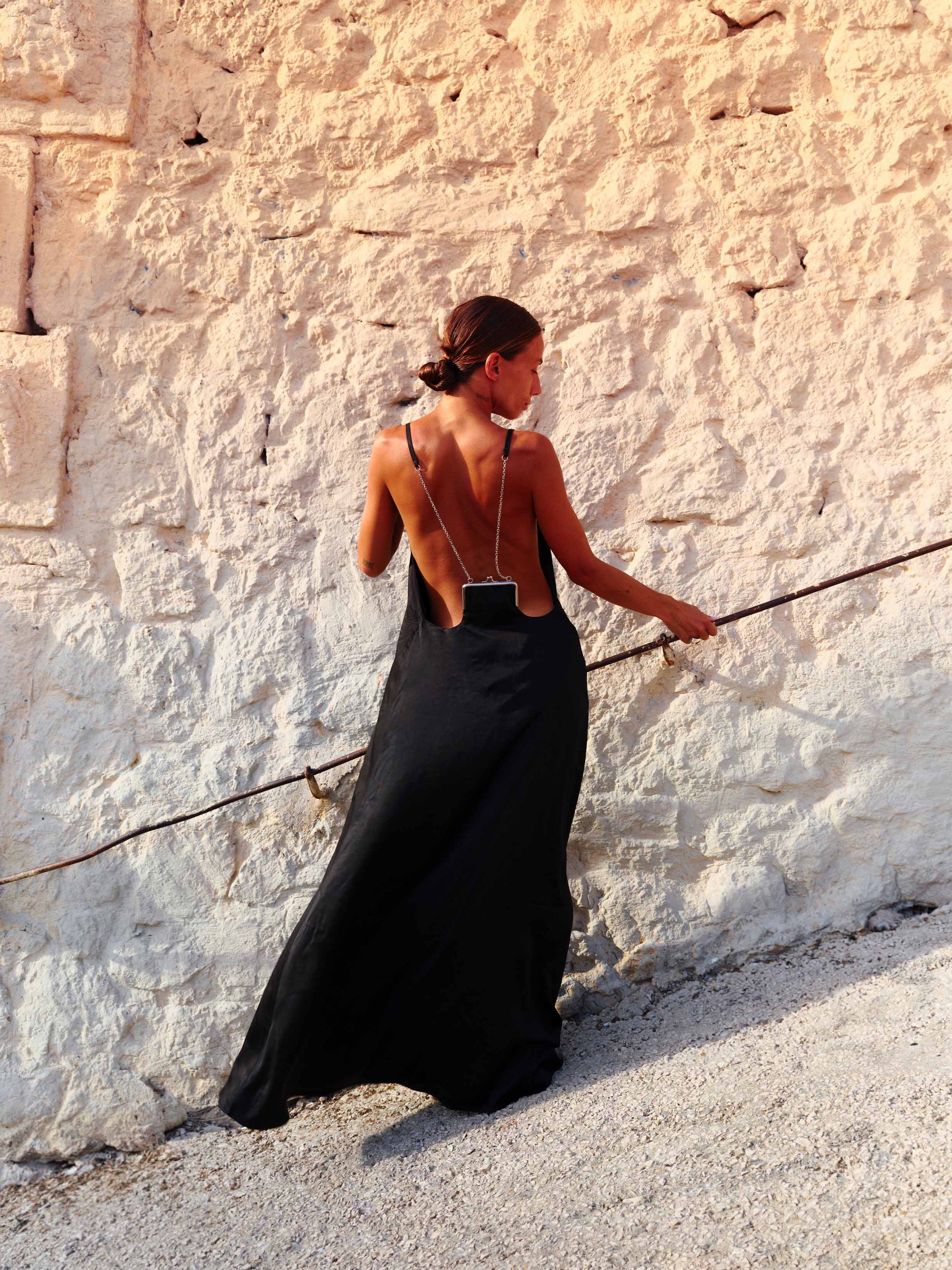 Backless maxi dress in black silk. Finished with our signature coin purse in repurposed lace.